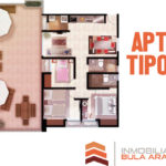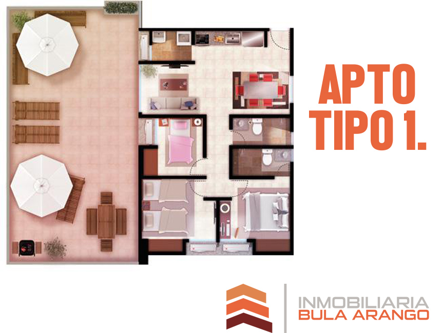 Apartamento tipo 1: 65 m2. Cuenta con 3 alcobas, 2 baños, sala-comedor, cocina, zona de labores, terraza y parqueadero cubierto.