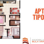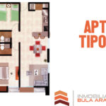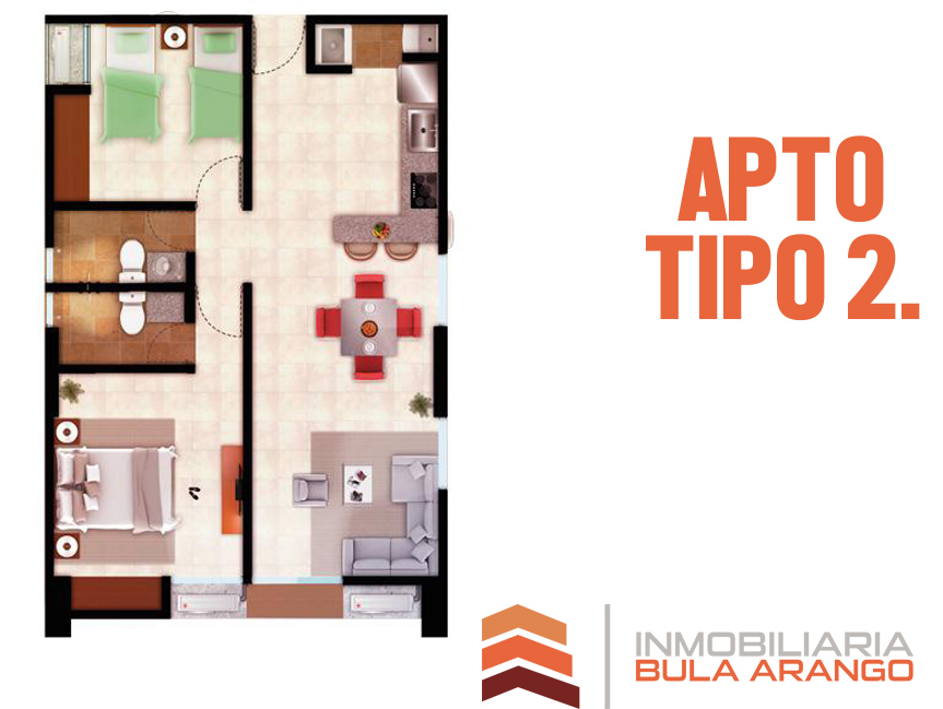 Apartamento tipo 2: 63,7 m2. Cuenta con 2 alcobas, 2 baños, sala-comedor, cocina, zona de labores y parqueadero cubierto.
