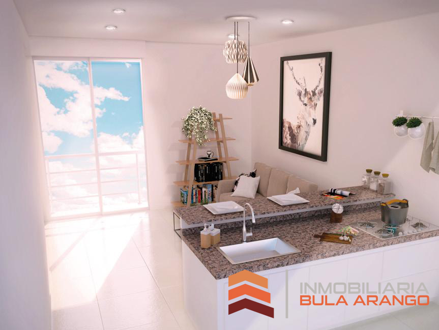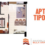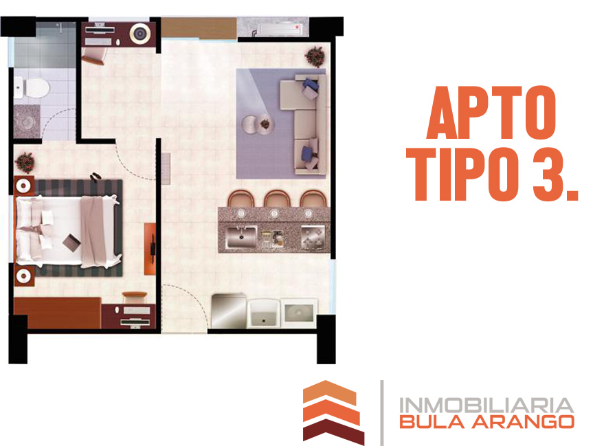 Apartamento tipo 3: 41 m2. Cuenta con 1 alcoba, 2 baños, sala-comedor, cocina, zona de labores y parqueadero cubierto.