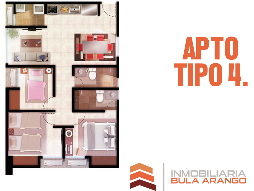Apartamento tipo 4: 65 m2. Cuenta con 3 alcobas, 2 baños, sala-comedor, cocina, zona de labores y parqueadero cubierto.