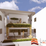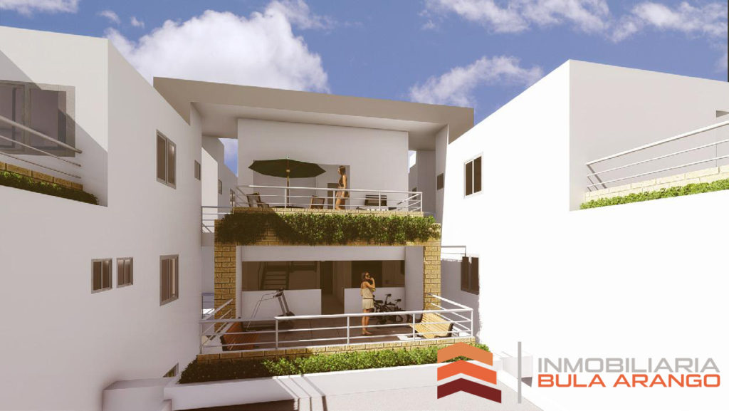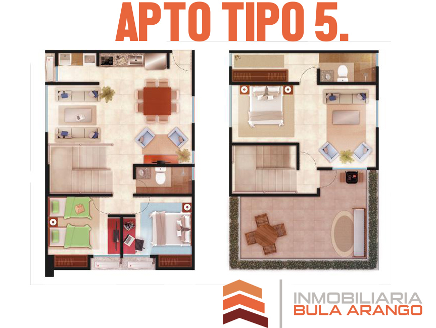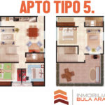 Apartamento tipo 5: 99,25 m2. Cuenta con 3 alcobas, 2 baños, 1 vestier, sala-comedor, sala de estar, cocina, zona de labores, terraza tipo mirador y 2 parqueaderos cubiertos.